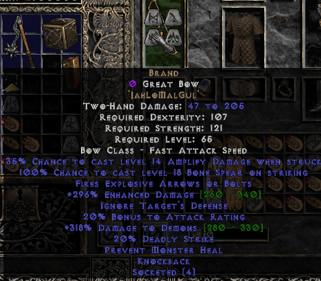メイン装備は、RW Bandです。速度的にはGrate Bowを選択しています。 貫通などはしないですがBone Spearが突き進んで見た目かっこいいです。またAmp発動、ITDとありますがエンチャントソーサとの相乗効果の、Fire Explosive Arrows Bolts です。 表示上のAttack Damegeは、3000から17Kとなります。