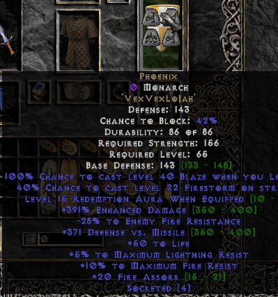 Deamになっていますが、これはHellクリアしてから変更しました。それまではGullaumes Faceをボス戦などはこっちのほうがCrushing Blowがあるので付け替えたりしています。更に防御を上げたい場合にはCrown of Agesも良いかもしれませんがSocket(2)とか出ないですものね。
