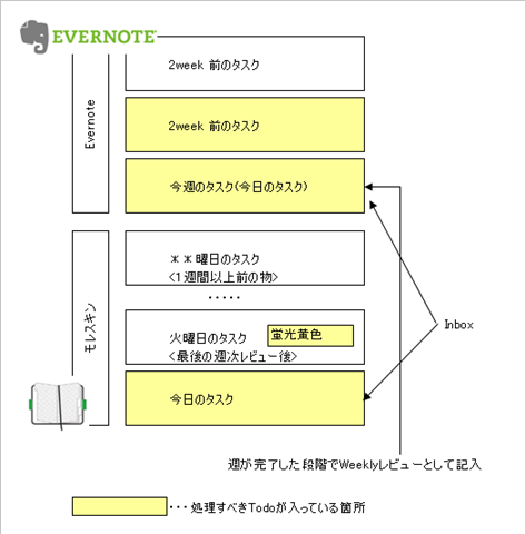 - 日々のタスク→モレスキンのページ、週次レビュー→Evernoteの1ページという棲み分け