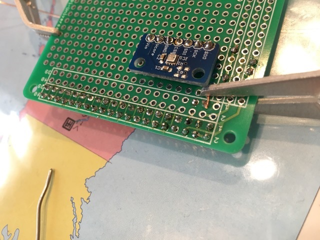 既にi2cを配線してしまっているので横からポリウレタン導線をつかってパッチしていきます。正直久しぶりすぎて疲れた。1時間くらいかけてようやく4本を配線した感じです。今回は、vccは3.3Vの方に接続しました。裏は汚いのでお見せできません。