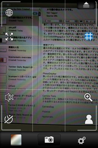 カメラアプリの操作的な差としてはシャッターに関して、「どのタイミングでリリースされるか」という実装の差があります。**標準のカメラアプリはタッチした指が離れたときにシャッターが落ちます。従って押しっぱなしでブレを減らして(もしくはシャッターチャンスを待って)リリースすると写真が上手い事撮れる理屈です。**難しいのはオートフォーカス(3GS)の機能です。タップしたところにフォーカスが合いますがちょっと私には難しいですね。