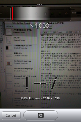 カメラアプリの機能をデータ分析して○×を付けても良いのですがこのアナログチックな動きは自分で遊んでみるのがやはり一番だと思います。カメラは今も昔もおもちゃです。100円でカメラが買えると思えば破格です。とは言え押さえておきたいポイントは幾つかあります。標準のカメラに対してどうかという点です。特にサイズ、ジオタグ(位置情報)は標準にはありますが、カメラアプリにはあったり無かったりです。逆に標準になくて多くのカメラアプリが備えているのが疑似ズームと手ぶれ補正の機能です。また”フィルタ”と呼ばれる一連の加工も各アプリの見所です。カメラの物理的な性能は同じですから以下に「表現」するかというのがiPhoneカメラアプリの楽しみになるのです。または私のようなヘタのために支援的(手ぶれ補正もどき)な機能が(ただ、実際のフィルムカメラは物理的に手ぶれ補正等はしてくれますが・・)欲しい時もあります。