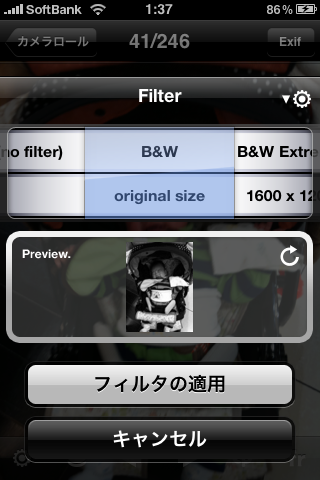 非常に初期に購入したフィルタアプリです。わかりやすく使い易いですね。ちょっとした加工などに未だに使うので常駐しています。いまはもっと多機能なフィルタアプリが沢山あるのでそれらを利用してもいいかもしれません。個人的にこのシンプルなUIが気に入っています。