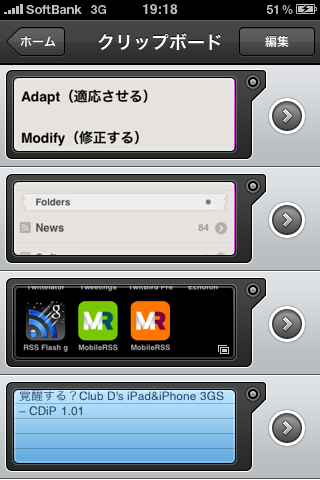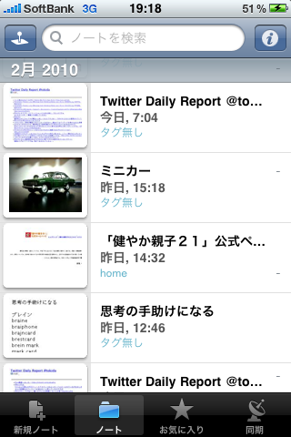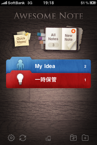これは日記アプリです。基本機能はTwitterとFlickrの情報を時系列に「日記」の様に表示してくれます。デザインといい素敵なアプリですね。でその様な情報に混じって日記が書けます。仕事やアイディアではなくてTwitterにつぶやくような事でもない事はここに書きます。子供の成長とか何があったとか家族の事が主です。「文字情報」はXMLファイルとしてExport出来ます。このバックアップという点ではどうにか機能を付けてインポートも出来るようになって欲しいなぁとは思います。もちろんパスワードロックが出来ます。