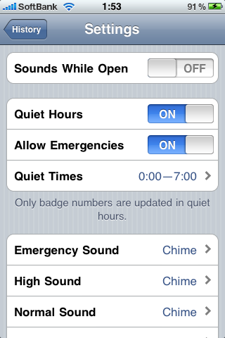これは設定画面の「QuietTime」で時間帯を指定する事により制御できます。また重要度が「Emergencies」で通知される場合にはプッシュをうけるという事が出来ます。従って、夜の間(0:00-7:00)はTwitterからの通知は受けないけどMailからの通知は受ける、と言った事が可能です。※Mail側及びTwitter側で重要度の制御が出来る必要があります。