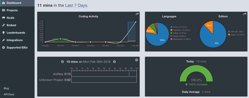 その昔、ライフログとか大好きでiPhoneが出てきたときには熱中していていました。 最近はめっきりこの手のものを利用しなくなったのですがエディタの操作を自動的に記録してくれる Wakatime は好きで利用してます。