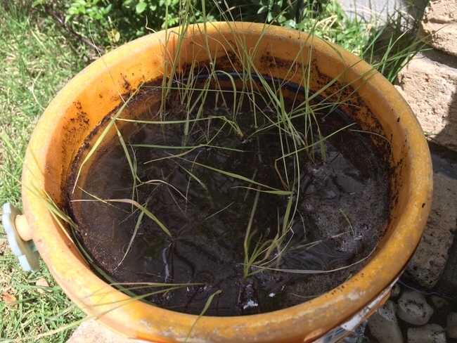 ずっと前に子供が水耕栽培してた米が育ってきたのでバケツに移した。育つのか?