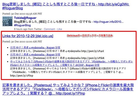 DeliciousのブックマークをFeedBunnerで取り込むようにしていました。これをしていると毎日送信されてくるTweetの内容の中に一日分のブックマークした情報が入ってきます。一応検索には引っかかる寸法です。
