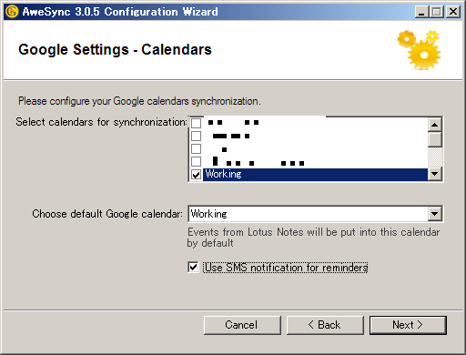 ⑥ 同期を行うカレンダーを選択します。 まずは専用のカレンダーを用意しておきました(ここでは「Working」というカレンダー)
