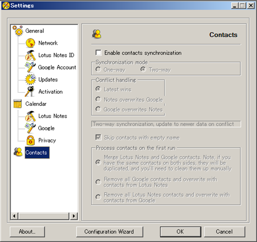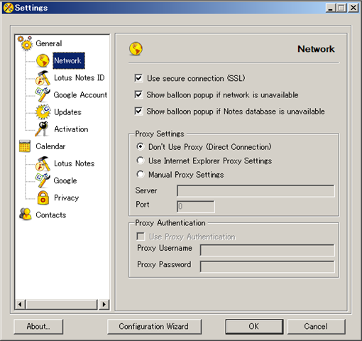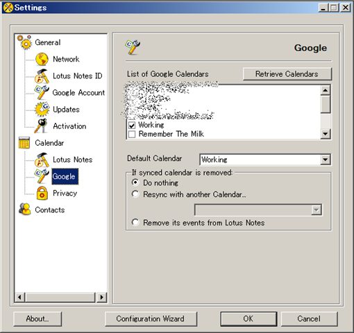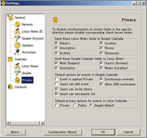 この項目のでは、カレンダーの同期を有効にするか無効にするかが選択できます。また構成ウィザードでは設定していない項目がありますので確認しておきます。プライバシーの項目は重要です。同期した際にイベントをどの様にするかがここで決められます。Notes上もしかしたら「プライベート」に設定する必要があるひとはこのあたりを調整すると可能になります。