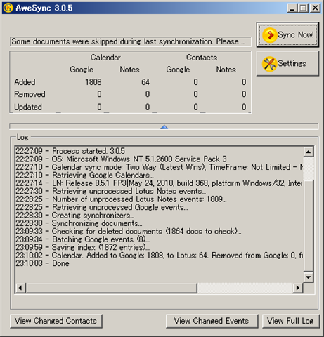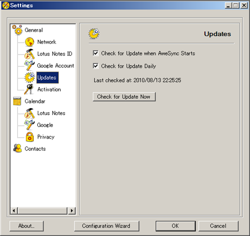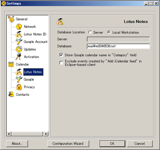 次にきになる同期の精度を確認します。簡単に試験してみると問題なく動作しているように思えます。実際に長期間使わないと分からないこともありますので問題がでればこのあたりに追記していきたいと思います。 変更内容 Lotus Notes Google 結果 既存の予定の時間を変更 ○ ○ 特に問題なく予定の時間や日付を変更してもいずれの場合も同期される 繰り返し予定の登録 ○ ○ お互いに「繰り返し」の予定として登録される。細かいところまでは確認してない。繰り返し予定の1日を消しても同期 複数の日付をまたぐイベント ○ ○ 日をまたぐ予定 ○ ○ 24時間以上の予定はNotes側では作成できないがGoogle側で作るとその状態で同期できる