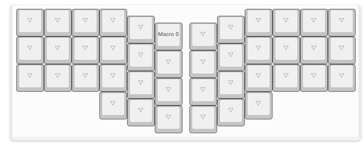 ピッチは標準、配列としては40%?30%なカラム配列。2列ほどずらしているので打ちやすさはある。真ん中が明けているのでそれほど狭い感じもしないので打ちやすい。K1Cで印刷ができるギリギリのサイズで作っているがこのまま左右に1列を追加したものが普通に使いやすそうだったので最終的には列を増やしました。R,Tの列も幾つか段を下げているものを考えてみたのですが、最終的にはそれぞ0.25ほど下げる形で落ち着いています。