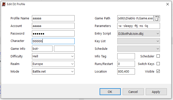 護衛として、パラディンを従えることも可能です。 aoff というコマンドを送ると攻撃はしないで後ろを付いてきてくれます(Botの兄貴は構わず攻撃してしまいますが)。Lv差がありすぎなのでレベリングには全く向いてないですね。エンチャントを持ったSocなどを入れておくと常にAct1でエンチャントをかけるために待機してくれます(この場合同じエリアに入ってないので素直に攻撃力だけあげるのでレベリングに非常に助かりますね)