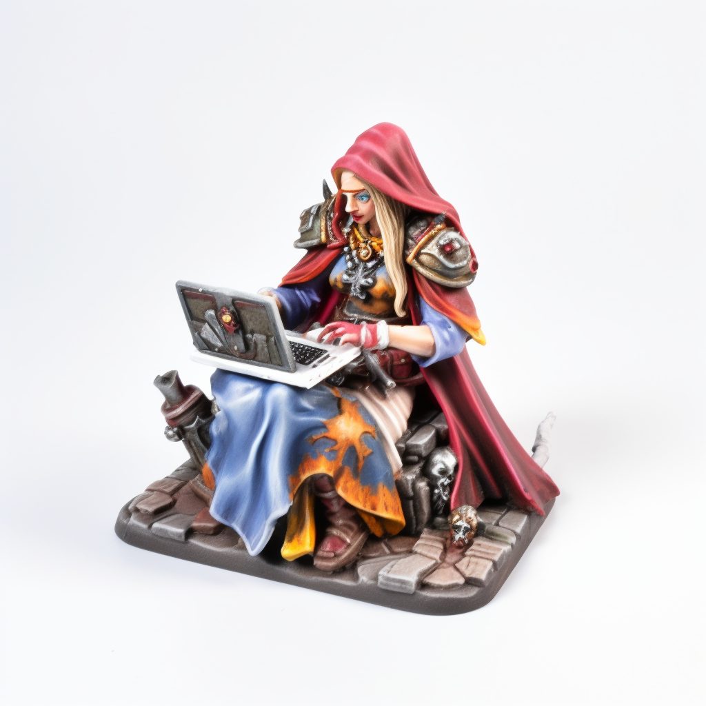 warhammer miniature of female sorcery with laptop , hand painted, plastic, detailed, white background, studio lighting, product photography