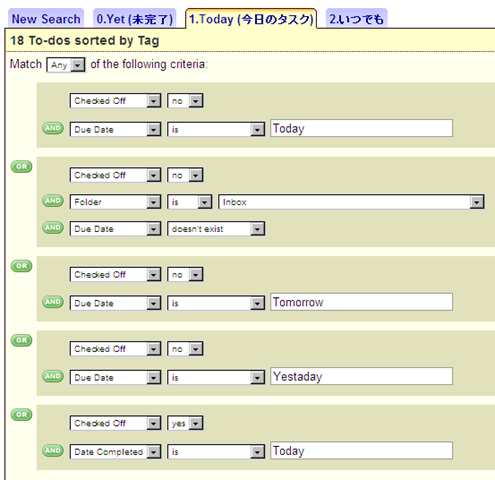 • 「Due Date」が「昨日/今日/明日」の未完了のタスク - Inboxフォルダに入っているタスク - 今日完了したタスク