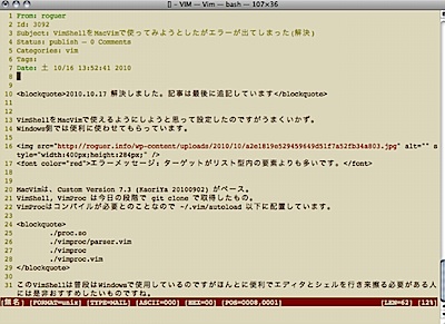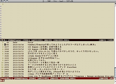 これはVimエディタのプラグインであるBlogit.vimからの投稿している。やはり使い慣れたエディタで文章をかけるのは一番いいと思う。ブログエディタ(という名称が正しいのかわからないが)もHTMLを書かなくてもいいという利点もあるがWordpressはそもそもある程度改行とかテキストのままでもその用にしてくれるのでそれほどHTML形式で投稿しても神経質にならなくていい。