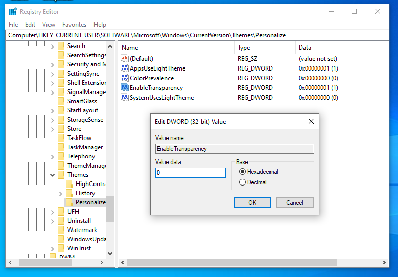 CurrentVersion\Themes\Personalize値の名前EnableTransparency種類REG_DWORD ※DWORD(32ビット)値値のデータ0 = 透明効果オフ