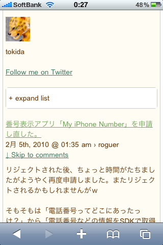 iPhone用に最適化されたページが存在する場合には最初に教えてくれるのが一番のポイントです。また画面も見てわかるようにかなり作りこまれています。機能的には画面が多少崩れるっぽいですが色々動きます。削ることなくiPhoneに最適化、そんな印象を受けます。また2本指でタップするとメニューが出ます。